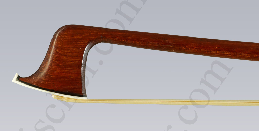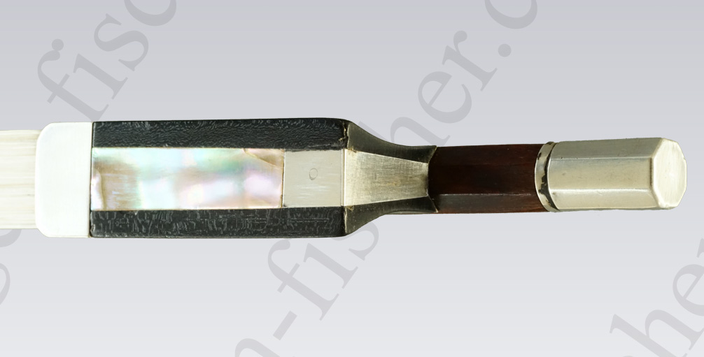 The bow is very well preserved. All metal parts are made of silver, the round Pernambuco stick is very firm, and the ebony frog is angularly shaped. The weight of the bow is 62 grams with a standard silver winding.