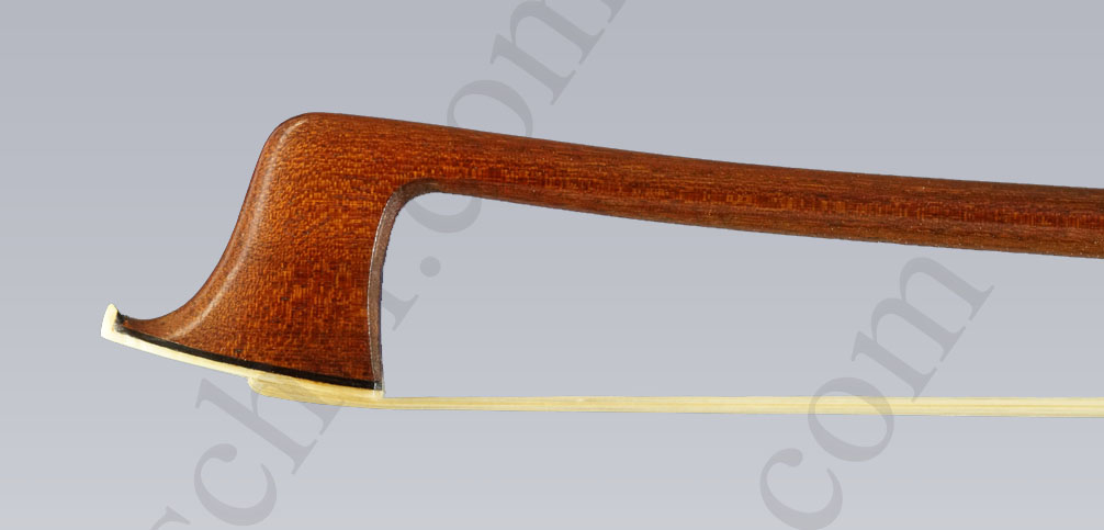 The round and solid rod is made of the best pernambuco. The ebony frog has a simple eye made of mother-of-pearl. The split gusset made of silver is fastened with 2 pins, the track of nickel silver is fastened with only one pin. The leg is made of 3 parts (silver-ebony-silver) and fastened with 2 pins. The state of preservation of the arch is very good. The weight with a normal silver wrapping is 61.5 grams.