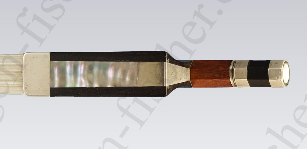 Our bow has an excellent solid angular stick made of pernambuco wood. It is made after a TOURTE model, the metal parts are made of silver. It weighs 60.5 grams with the normal silver wrapping. The condition is perfect.