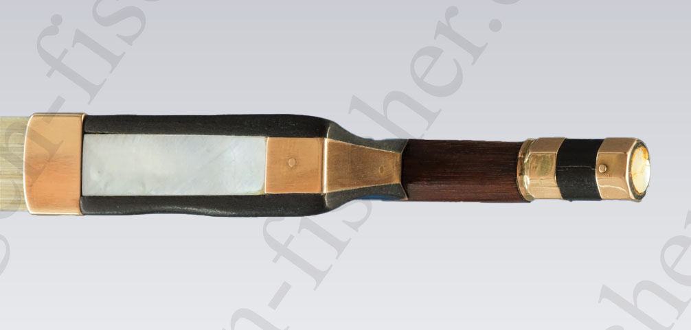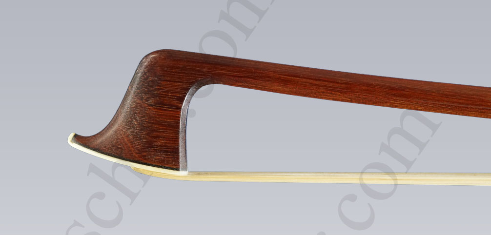 Die achtkantige Stange ist aus sehr gutem  Fernambuk  gearbeitet. Der Ebenholzfrosch hat ein einfaches Perlmuttauge. Der einteilige Zwickel und auch das dreiteilige Beinchen sind jeweils mit 2 Stiften befestigt. Die Bahn ist mit 2 Schrauben befestigt.
