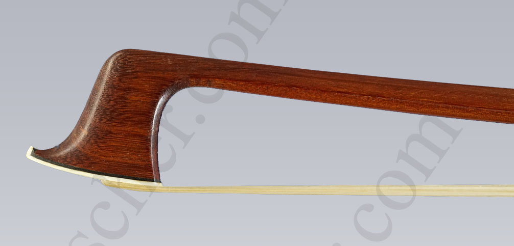 Der sehr gut erhaltene Bogen hat eine eckige Stange aus leicht geflammten Fernambuk, er ist mit einer zarten orangefarbenen Schellackpolitur versehen und wiegt mit einer leichten Silberbewicklung 60,7 Gramm.