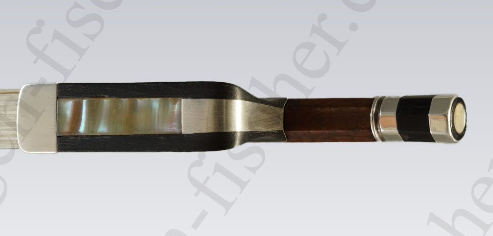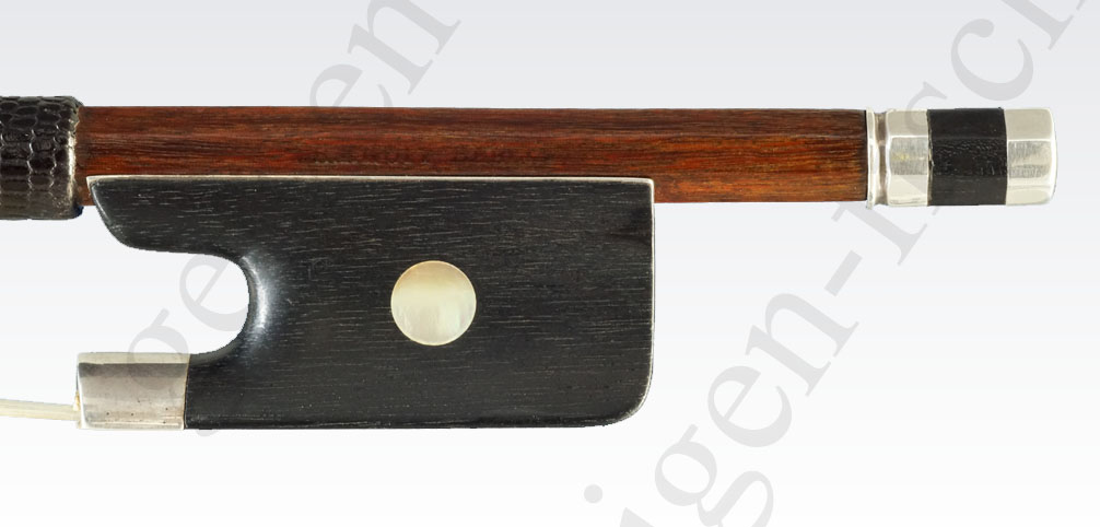 Die runde Stange ist aus rötlich-gelbbraunem Fernambuk gearbeitet. Der Ebenholzfrosch hat ein einfaches Perlmuttauge. Der runde Zwickel ist mit 2 Stiften, die Bahn mit 2 Schrauben befestigt. Der Bogen wiegt 78,1 Gramm. Alle Metallteile sind aus Silber gearbeitet.