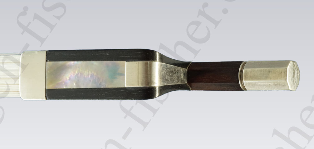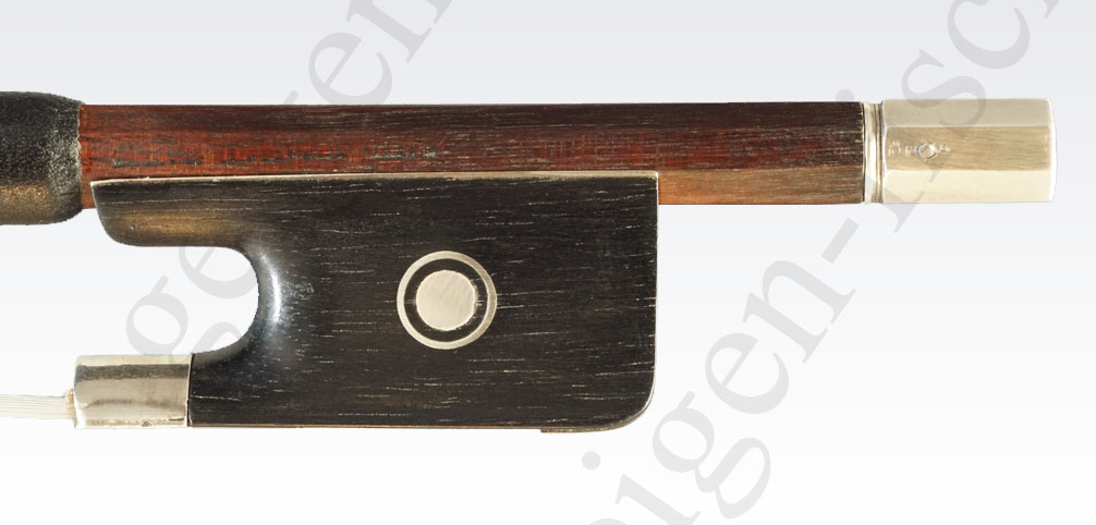 Unser Bogen wurde an den Geigenbauer Paul JOMBAR verkauft und trägt dessen Stempel „PAUL JOMBAR PARIS“. Die runde und feste Stange ist aus sehr gutem Fernambuk gearbeitet. Der Ebenholzfrosch hat ein Perlmuttauge mit Silberring (Pariser Auge). Der runde Zwickel ist mit drei Stiften befestigt, die Bahn ist mit zwei Stiften befestigt. Alle Metallteile sind aus Silber gearbeitet. Der Erhaltungszustand des Bogens ist sehr gut. Das Gewicht mit einer leichten Silbergespinstbewicklung beträgt 60,5 Gramm.