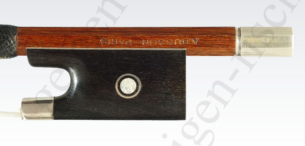Französischer Violinbogen von Mars Auguste Husson (Paris) aus dem Jahr 1925. Dieser Bogen ist ein besonderes Exemplar von M.A. Husson, der ein langjähriger Mitarbeiter von Vigneron Fils war. Der Bogen zeigt keinerlei Gebrauchsspuren, hat eine feste Stange und wiegt mit der originalen Gespinstbewicklung 59 Gramm. Mit einer normalen Silberbewicklung läge das Gewicht bei 61 Gramm.