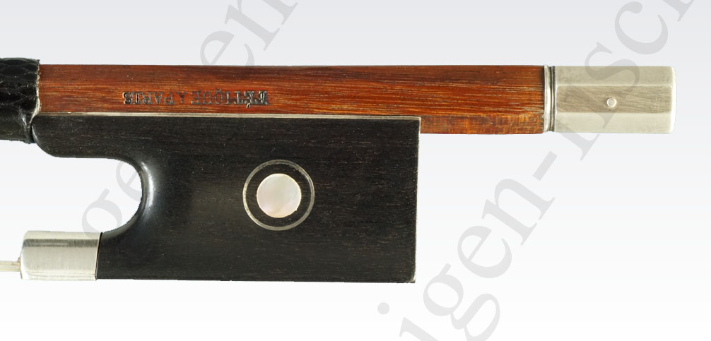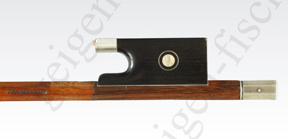 Victor FETIQUE wurde wie so viele großartige Bogenmacher in Mirecourt geboren und arbeitete bei mehreren bekannten Bogenmachern (HUSSON, MALINE, MIQUEL, BAZIN). Victor FETIQUE zog 1901 nach Paris und arbeitete bei CARESSA & FRANCAIS bevor er sich im Jahr 1913 selbstständig machte. Unser Bogen hat eine runde Stange aus sehr gutem Fernambuk in der Farbe braunorange. Der Ebenholzfrosch trägt ein Perlmuttauge mit einem schmalen Silberring (Pariser Auge). Der geteilte Zwickel ist mit je einem Stift befestigt und die Silberbahn ist ebenfalls mit zwei Stiften befestigt. Das Beinchen ist eine Silberkapsel, die mit einem Stift befestigt ist.